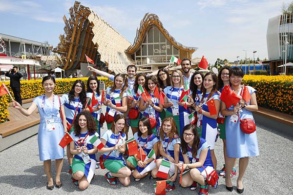 这是6月8日,在中国馆外,志愿者们手持中意两国国旗合影。(新华社记者叶平凡摄)