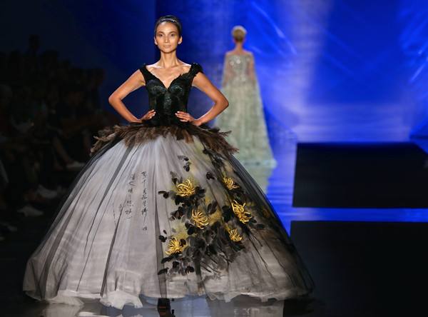 7月13日,在中国馆南京周闭幕时装秀上,模特展示中国设计师劳伦斯·许的作品。当日,中国高级定制设计师劳伦斯·许的云锦时装秀在米兰世博会南京周上演,展示了37套由云锦面料制成的高级定制礼服。(新华社记者金宇摄)