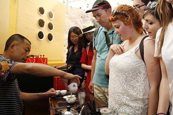 这是6月8日,在中国馆,参观者体验中国福建功夫茶。(新华社记者叶平凡摄)