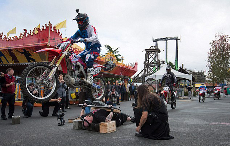 据英国《每日邮报》10月28日报道,加拿大特技演员奥百斯(Burnaby Q. Orbax)本周一在温哥华市“惊魂之夜”活动(Fright Nights)上为市民表演了一连串惊险刺激节目,他躺在布满钉子的钢板上,让70辆摩托车从他身上辗过,但他却毫发无伤,刷新了该项活动新的吉尼斯世界纪录。