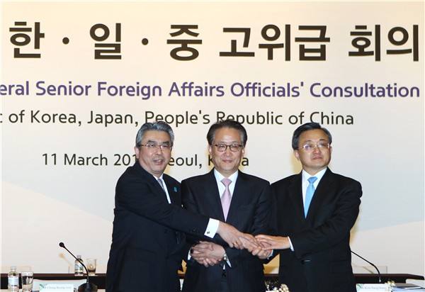 图为2015年3月11日,中国外交部副部长刘振民(右)、韩国外交部次官补(部长助理)李京秀(中)、日本外务省审议官杉山晋辅在会前合影。新华社记者姚琪琳摄