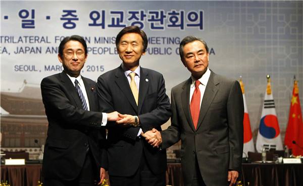 图为2015年3月21日,中国外交部长王毅(右)与韩国外交部长尹炳世(中)、日本外相岸田文雄在第七次中日韩外长会前合影。新华社记者姚琪琳摄