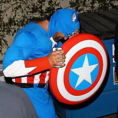 大叔Gerard Butler扮成美国队长一直不太敢面对镜头,这是觉得自己有多搞笑……