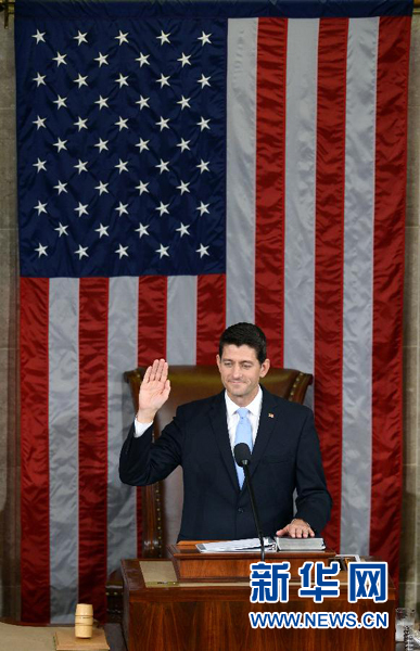 10月29日,在美国华盛顿国会山,保罗·瑞安宣誓就任众议院议长。当日,美国威斯康星州联邦众议员、2012年美国大选共和党副总统候选人保罗·瑞安当选美国众议院第62任议长。 新华社记者 殷博古 摄