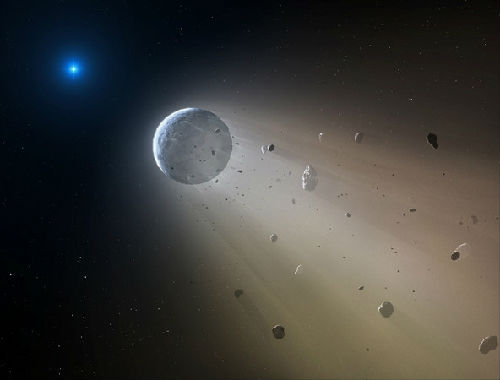 不过,关于岩质天体的来源仍是个问题。最可能的版本,就是有颗现存行星环绕白矮星过程中变得不稳定,使它逐渐往中间白矮星旋入。