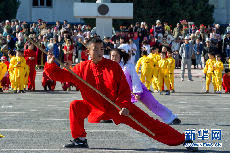 10月29日,在吉尔吉斯斯坦奥什,奥什国立大学孔子学院的学生在庆典活动上表演武术。 吉尔吉斯斯坦第二大城市、古丝绸之路重镇奥什29日举行“城市日”活动,庆祝建城3015周年。中国驻奥什总领馆代表中方表示祝贺。 新华社发(丹尼尔摄)