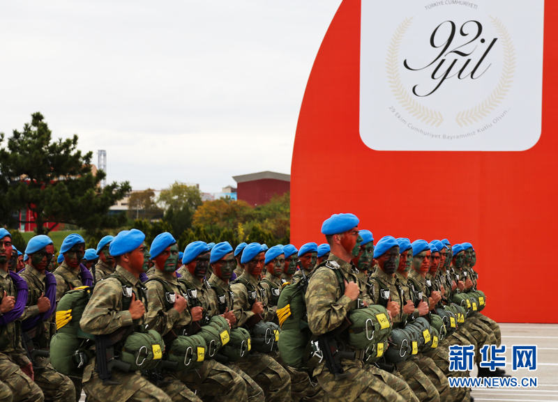 土耳其特种作战部队方阵经过主席台。10月29日,土耳其在首都安卡拉举办阅兵式,庆祝共和国建立92周年。阅兵式在土耳其总统府交响乐团的美妙乐声中拉开帷幕,来自土耳其学生、警察、武警、灾害和应急救助部队、骑兵等方阵走过检阅台,土耳其奥斯曼军乐团和F-16特技飞行战机在现场进行表演。土耳其总统雷杰普·埃尔多安出席阅兵庆祝活动。新华社记者邹乐摄