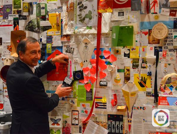 新华国际客户端了解到,这一活动是由米兰世博会组委会和世博会博物馆共同策划、组织的。在米兰世博184天展期内,有超过100多个国家的参展方把他们的一些世博纪念物和有文化色彩的象征符号,陆续汇集起来,形成了五彩缤纷、蔚为壮观的一面“世博墙”。加上各参展方提供的赠品,这面“世博墙”最终将长达60多米,面积接近180多平方米。