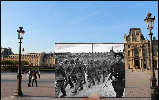 1940年,德国军队占领巴黎,军队从埃菲尔铁塔下面经过。现在,埃菲尔铁塔吸引了无数游客,几乎已经成为巴黎的代名词。巴黎最具标志性的地标建筑看上去与二战时几乎没有太大变化,唯一的区别就是今天来这些地方的是成千上万的游客,而二战期间则是士兵。法国艺术家朱利安·卡内兹(Julien Knez)将20世纪40年代的巴黎老照片与今天的照片融合,对比巴黎70多年来发生的变化。