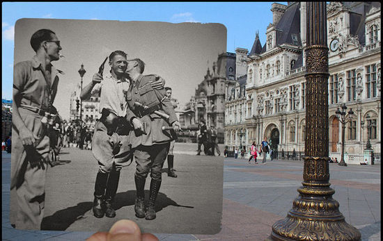 1940年,德国军队占领巴黎,军队从埃菲尔铁塔下面经过。现在,埃菲尔铁塔吸引了无数游客,几乎已经成为巴黎的代名词。巴黎最具标志性的地标建筑看上去与二战时几乎没有太大变化,唯一的区别就是今天来这些地方的是成千上万的游客,而二战期间则是士兵。法国艺术家朱利安·卡内兹(Julien Knez)将20世纪40年代的巴黎老照片与今天的照片融合,对比巴黎70多年来发生的变化。