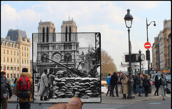 1940年,德国军队占领巴黎,军队从埃菲尔铁塔下面经过。现在,埃菲尔铁塔吸引了无数游客,几乎已经成为巴黎的代名词。巴黎最具标志性的地标建筑看上去与二战时几乎没有太大变化,唯一的区别就是今天来这些地方的是成千上万的游客,而二战期间则是士兵。法国艺术家朱利安·卡内兹(Julien Knez)将20世纪40年代的巴黎老照片与今天的照片融合,对比巴黎70多年来发生的变化。