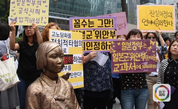 2014年7月2日,在韩国首尔的日本驻韩国大使馆前,民众在慰安妇少女像旁手持标语参加抗议活动。(新华社记者姚琪琳摄)