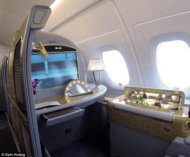 在空中,他住的是装有滑动门的私人头等舱套房,拥有一个个人的小吧台,可以放倒成床的高级座椅,以及由机舱主厨烹调的任点佳肴。