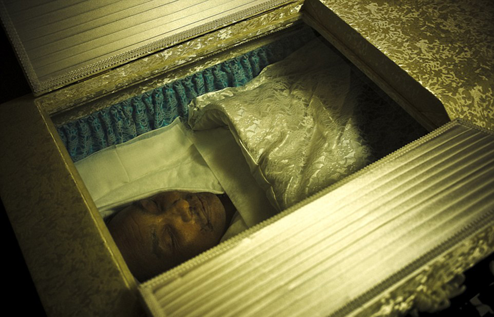 黑帮成员头目尸体被安放在奢华的棺木中,以示成员对其的尊敬。(网页截图)