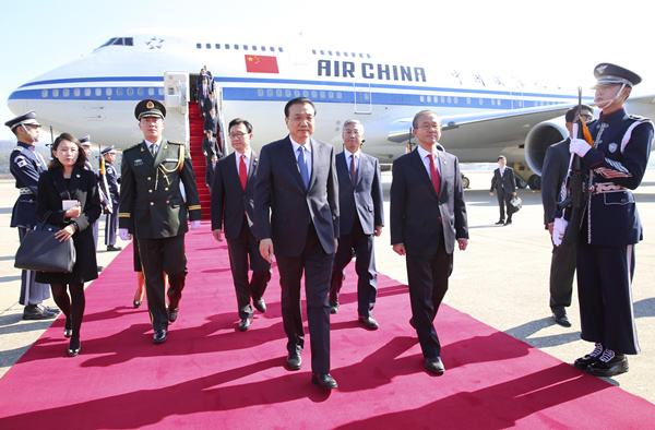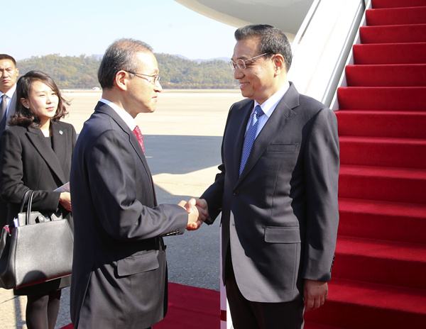 李克强表示,这是我担任中国国务院总理后首次正式访问韩国。我将同韩国领导人就进一步深化中韩战略合作伙伴关系和共同关心的问题全面深入交换意见,同韩国各界广泛交流。期待通过此访增进友好、巩固互信、扩大交流、创新合作,让中韩睦邻友好和互利务实合作更上层楼。