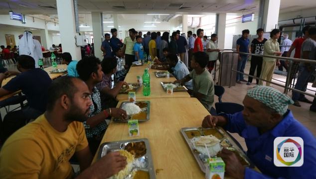 外籍劳工在“劳工城”食堂用餐。(图片来源:新华/法新)