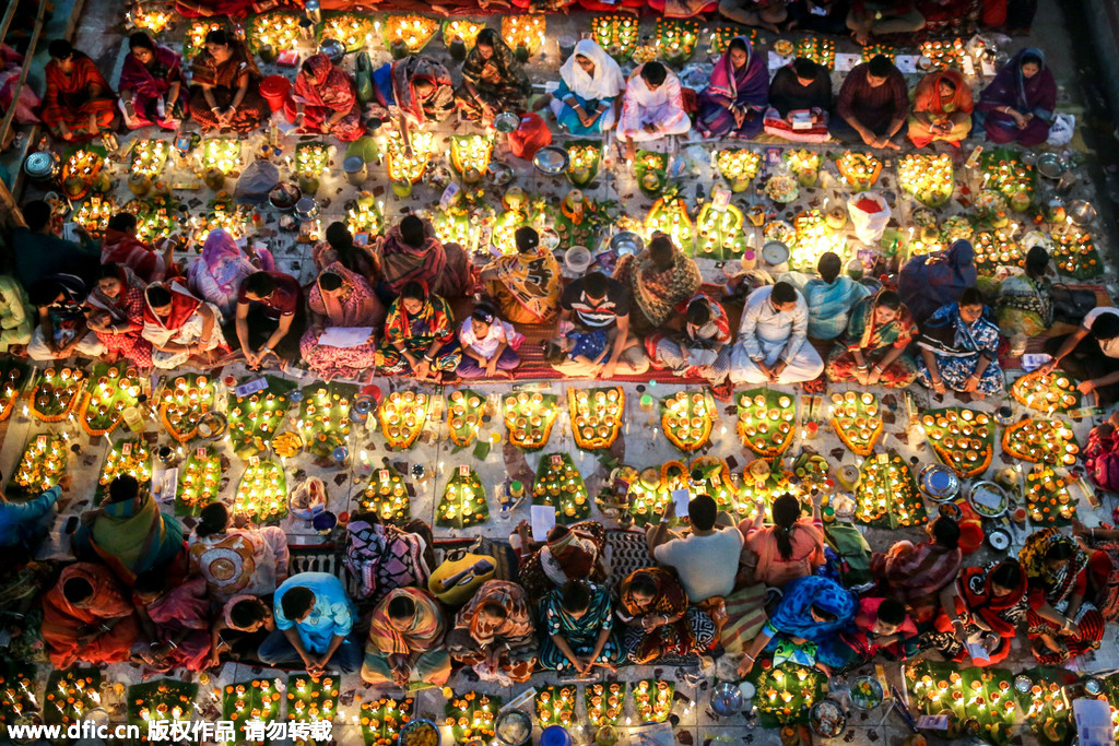 当地时间2015年11月3日,孟加拉国达卡,在每年的Rakher Upobash节日期间,成千上万的印度教教徒带灯坐在Shri Lokanath Brahmachar Ashram庙宇前,向众神祈祷。 Baba Lokenath是18世纪孟加拉印度教圣人和哲学家,众多信徒通过传统仪式向其祈祷。