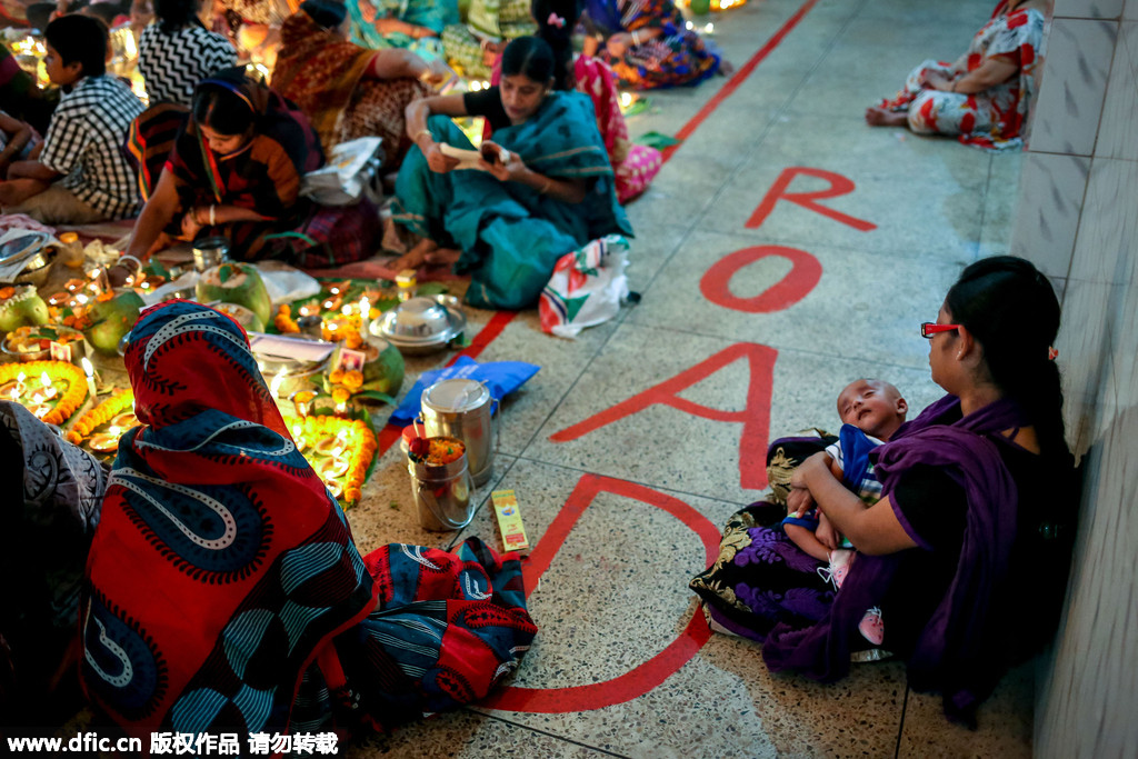 当地时间2015年11月3日,孟加拉国达卡,在每年的Rakher Upobash节日期间,成千上万的印度教教徒带灯坐在Shri Lokanath Brahmachar Ashram庙宇前,向众神祈祷。 Baba Lokenath是18世纪孟加拉印度教圣人和哲学家,众多信徒通过传统仪式向其祈祷。