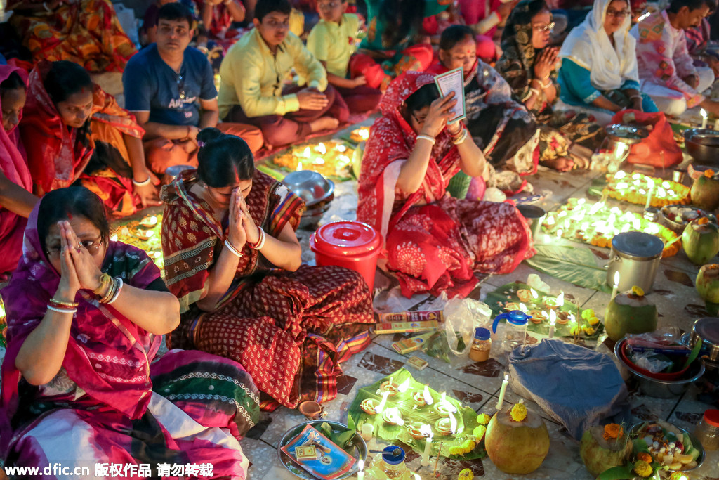 当地时间2015年11月3日,孟加拉国达卡,在每年的Rakher Upobash节日期间,成千上万的印度教教徒带灯坐在Shri Lokanath Brahmachar Ashram庙宇前,向众神祈祷。 Baba Lokenath是18世纪孟加拉印度教圣人和哲学家,众多信徒通过传统仪式向其祈祷。