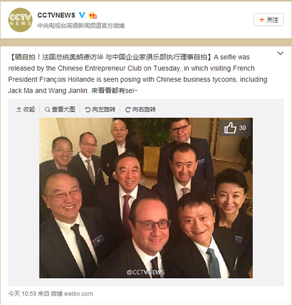 据新浪微博@CCTVNEWS,11月3日,中国企业家俱乐部发布了一张自拍照。法国总统奥朗德与中国商界大佬马云、王健林等共同出现在一张照片上。