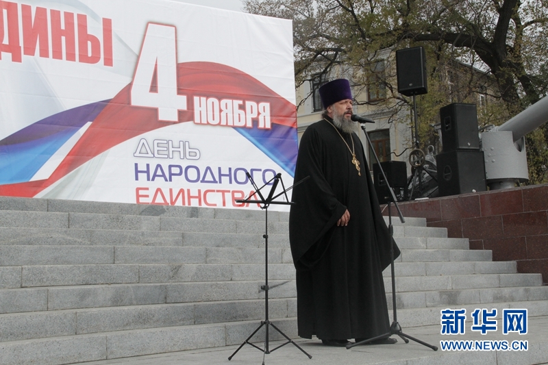 11月4日,俄罗斯远东符拉迪沃斯托克2000多名各界民众在市中心太平洋舰队荣誉纪念碑广场举行活动,庆祝俄罗斯民族团结日。俄罗斯2005年设立了这一节日,为了纪念本国军民1612年将莫斯科从外国武装占领状态下解放出来,同时彰显民族团结的重要性。新华网记者朱玉书 摄