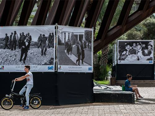图为拉宾广场上纪念拉宾遇刺20周年的巨幅照片