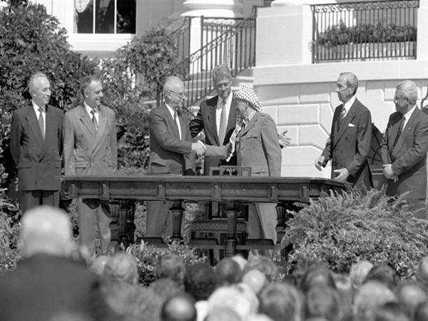 图为拉宾与阿拉法特握手(新华社记者宋晓刚摄)