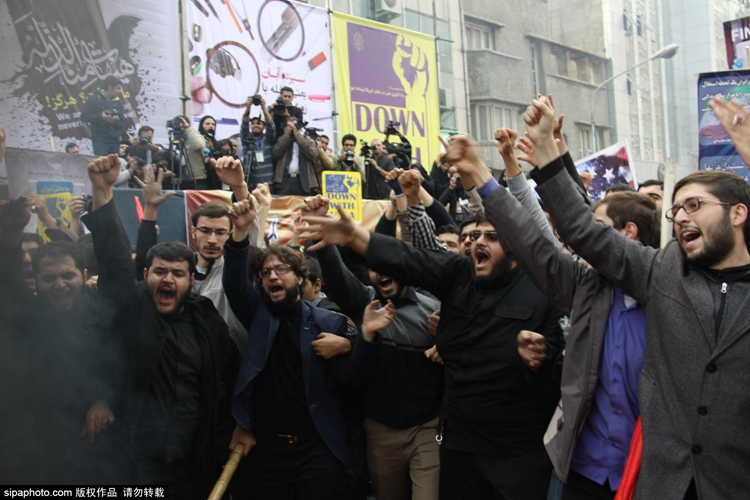 当地时间2015年11月4日,伊朗德黑兰,伊朗人在前美国驻德黑兰大使馆外举行示威,当天是伊朗人质危机发生36周年,示威者在示威期间焚烧了美国和以色列国旗。1979年,伊朗伊斯兰革命后,美国驻德黑兰大使馆被占领,52名美国外交官和平民被扣留为人质的一次危机。这场人质危机始于1979年11月4日,一直持续到1981年的1月20日,长达444天。(图片来源:希帕中国)