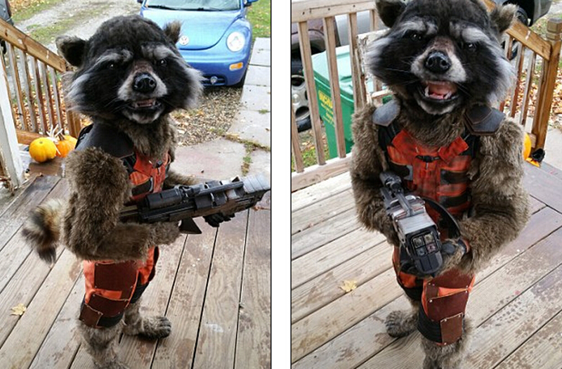 据悉,这件套装仿照电影《银河护卫队》里的漫画角色“火箭浣熊”制作而成。该电影的导演詹姆斯·古恩(James Gunn)在网上看到后赞誉有加,称“又一件超酷的万圣节服饰,大家真的是棒极了!”