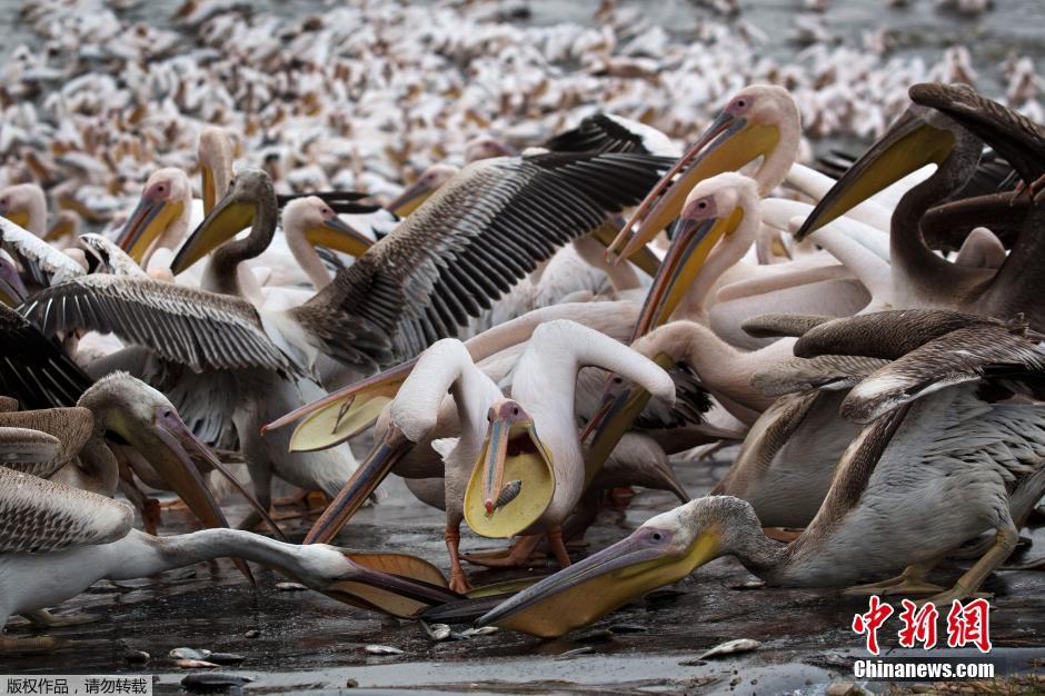 当地时间2015年11月5日,以色列特拉维夫,数千只白色鹈鹕在蓄水池等待以色列农民喂鱼。数千只迁徙的鹈鹕途经以色列,当地农民对其喂食,避免对商业鱼池的破坏。