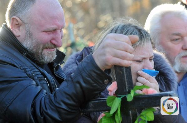 失事客机遇难者尼娜·卢先科亲属在她的葬礼上痛哭。(图片来源:新华/法新)