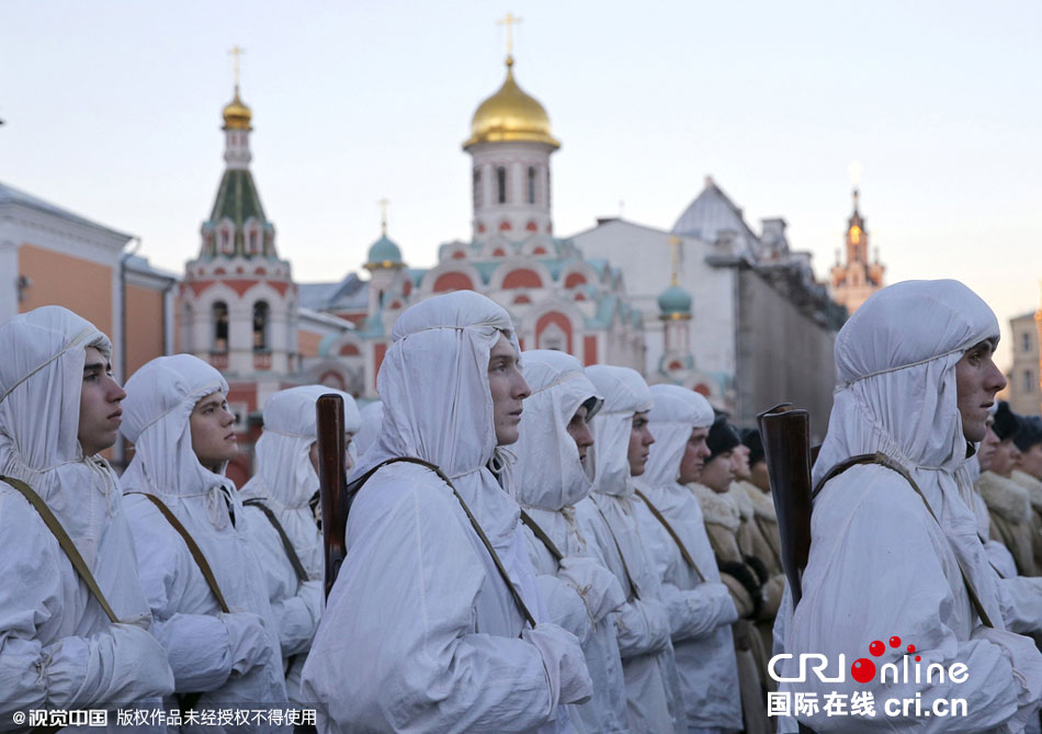 当地时间2015年11月6日,俄罗斯莫斯科,身着历史服装的俄罗斯士兵进行阅兵彩排。俄罗斯将在11月7日举行阅兵,纪念卫国战争期间1941年红场阅兵74周年。图片来源:视觉中国