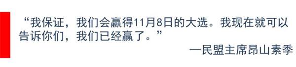 民盟主席昂山素季则信心满满:“我保证,我们会赢得11月8日的大选。所以,我们不会再用‘我们会赢’这样的说法,我现在就可以告诉你们,我们已经赢了。”