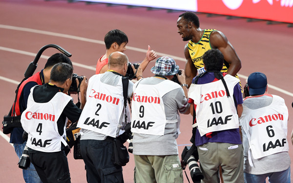 2015年8月29日,国际田联世界田径锦标赛男子4X100米接力决赛在北京国家体育场“鸟巢”举行。这是赛后中国队选手莫有雪(左)向牙买加队选手博尔特致意。(新华社记者李文摄)