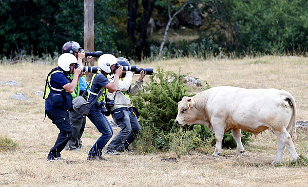 2015年7月19日,2015年环法自行车赛赛道边一头吃草的牛成为记者们摄影的绝佳“背景”。(新华社/欧新中文)
