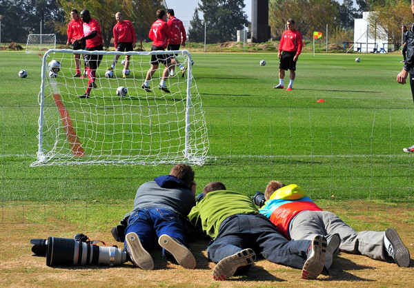 2010年6月11日,南非世界杯足球赛期间,摄影记者在拍摄瑞士队赛前训练。(新华社/法新)