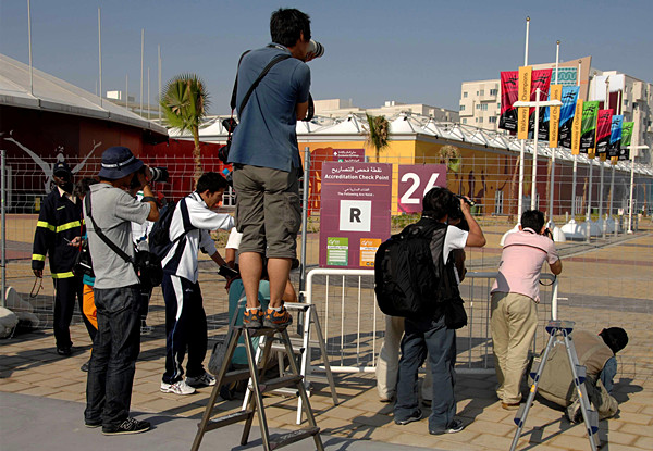 2006年11月27日,多哈亚运会开幕前,记者透过围栏拍摄多哈亚运会运动员村。(新华社记者陈燮摄)