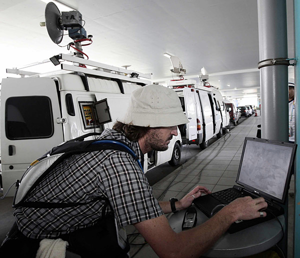 2004年8月8日,雅典奥运会在即,各代表团陆续抵达,一名摄影记者在雅典国际机场现场发稿。(新华社记者兰红光摄)(编辑王雪梅,新华国际客户端报道)
