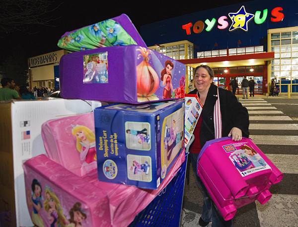 2011年11月25日,在美国弗吉尼亚州费尔法克斯,一名顾客在玩具商场“血拼”后“战果”颇丰。(新华社/法新)