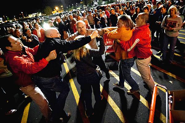 2012年11月22日夜,在美国肯塔基州鲍灵格林市,在一家商场外排队购物的顾客发生争执。(新华社/美联)