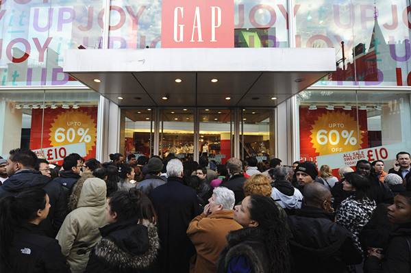 2011年12月26日,传统的节礼日销售期间,在英国首都伦敦市中心的商业街牛津街,购物者等待进入GAP专卖店。(新华社记者曾毅摄)
