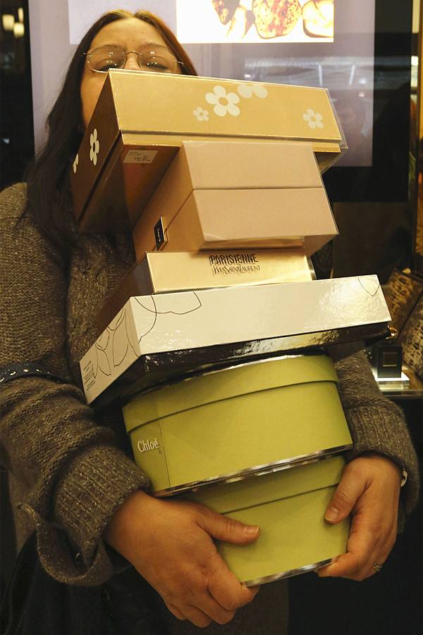 2012年12月26日,在英国伦敦塞尔弗里奇百货公司,一名顾客怀抱着刚买到的打折香水。(新华社 /法新)