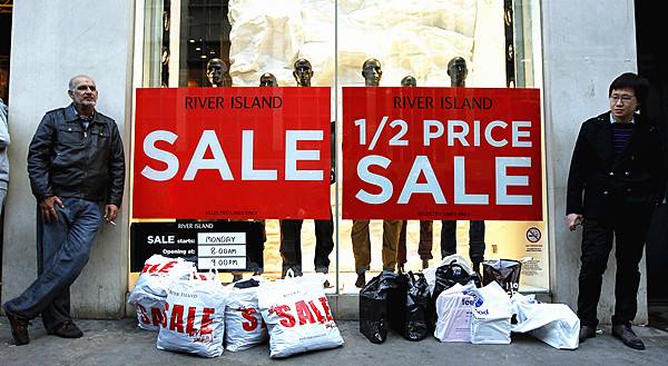2011年12月26日,在英国伦敦,两名男子站商店橱窗前,身旁堆满了购物袋。(新华社/欧新)