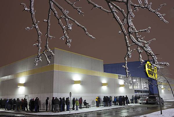 2013年12月26日,在加拿大多伦多市区,顾客冒雪在一家商店门前排队等候开门购物。新华社发(邹峥摄)