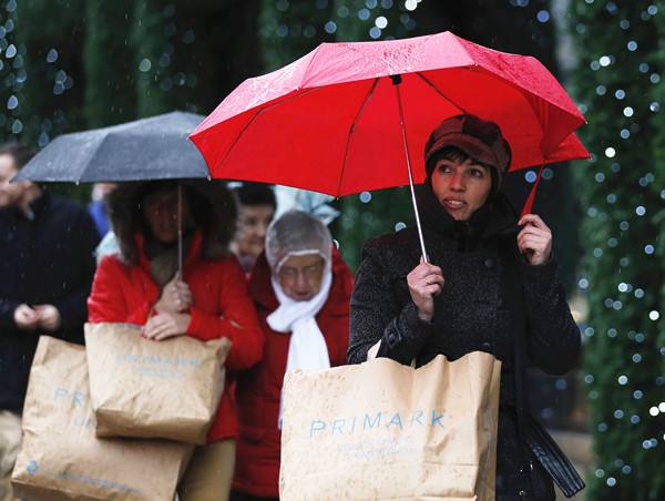 事实上,在节礼日和圣诞节前,人们就已掀起购物热潮。这是2013年12月23日,在英国首都伦敦,人们冒雨采购。(新华社/路透)