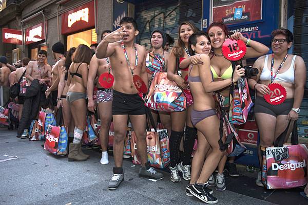 2014年1月7日,在西班牙马德里,顾客不顾严寒身穿内衣在服装店外等候。当日,马德里开始冬季大减价,一家服装店举行“袒裎而入,整装而出”促销活动,前100名顾客如果只穿内衣进入卖场,即可免费挑选一身服装。不少顾客在店外彻夜等候。(新华社记者谢海宁摄)