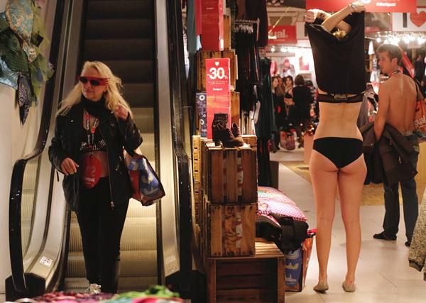 无独有偶。2014年1月8日,法国冬季打折季的第一天,巴黎Desigual服装店当天也推出特惠活动,到店前100名仅穿内衣的顾客可以免费获得商品。这是顾客仅穿内衣进店后挑选商品。(新华社/路透)