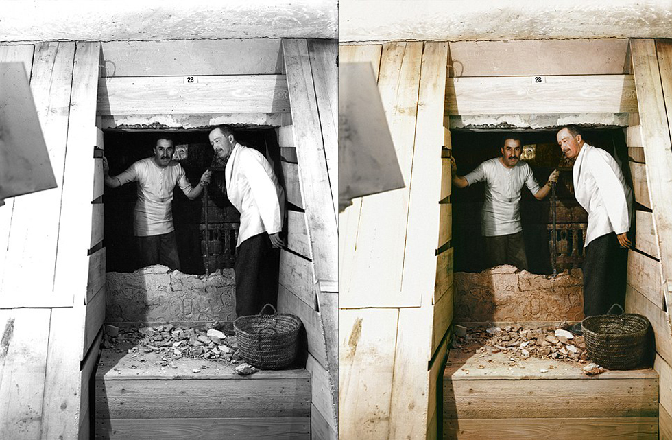 资助挖掘工作的卡纳冯勋爵(Lord Carnarvon)与卡特在墓室外合影。在图坦卡蒙墓室被发现前,卡纳冯勋爵曾威胁要撤回资金支持。(网页截图)