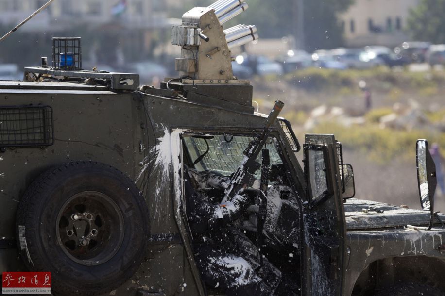 10月16日,拉姆安拉附近,一名以色列军警在防爆车内遭到巴勒斯坦抗议者袭击。