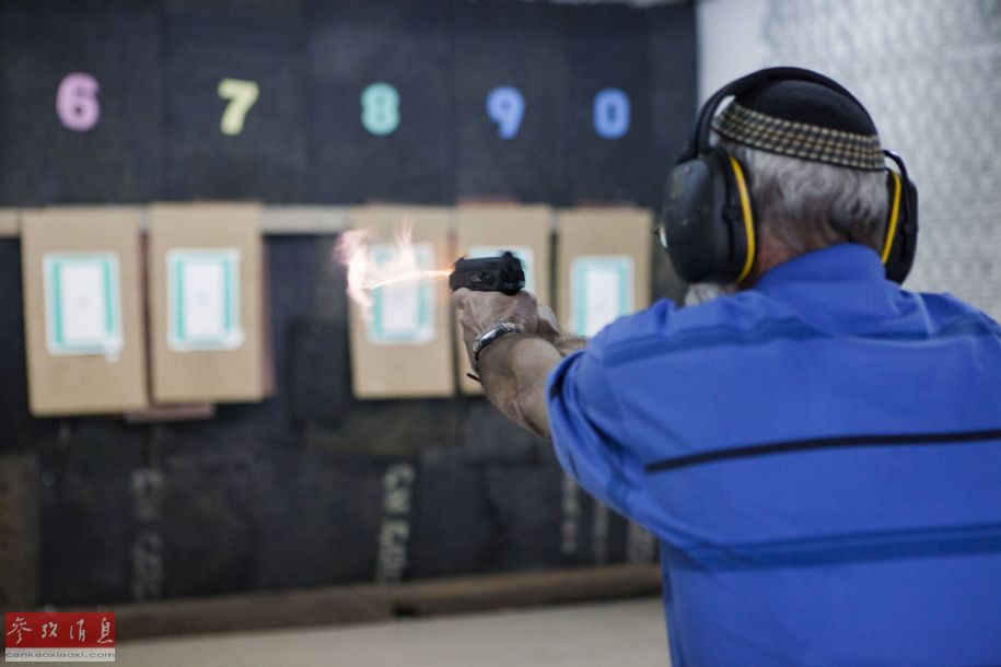 10月11日,约旦河西岸犹太人定居点内,一名以色列老人正在练习手枪打靶。